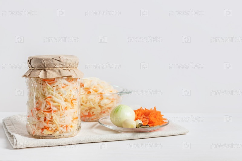 Домашняя квашеная капуста с морковью в стеклянной банке и миске на белом деревянном фоне. Ферментированная пища