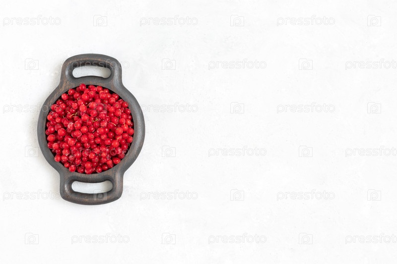 Замороженные ягоды.Замороженная красная смородина в деревянной тарелке на белом фоне.Замороженные красные ягоды.Копировальное пространство.Вид сверху, плоский слой