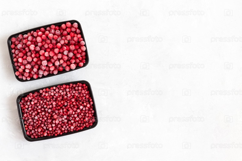 Замороженные ягоды в контейнерах на белом фоне. Брусника и клюква. Замороженные продукты. Скопируйте пространство, посмотрите сверху