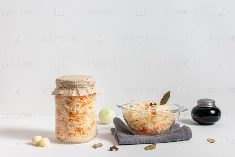 Домашняя квашеная капуста с морковью в стеклянной банке и миске на белом деревянном фоне. Ферментированная пища