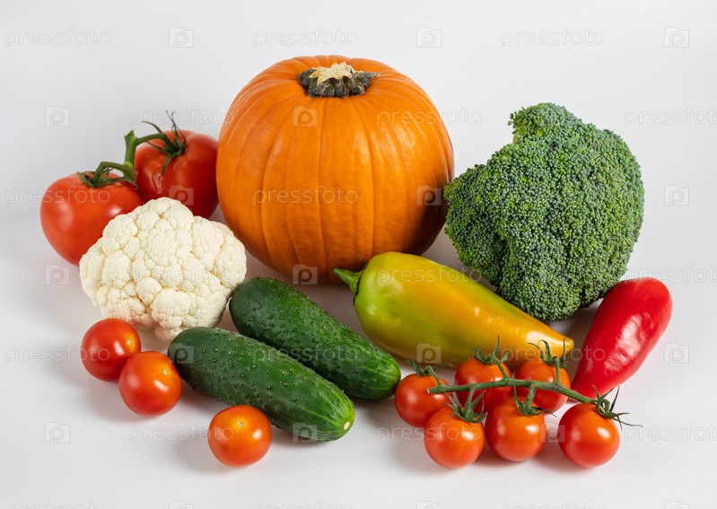 Концепция здорового питания. Овощи на белом фоне. Баннер. Тыква, помидоры, огурцы, перец, цветная капуста и брокколи