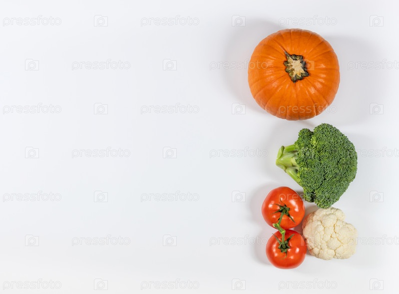 Концепция здорового питания. Овощи на белом фоне. Тыква, помидоры, цветная капуста и брокколи