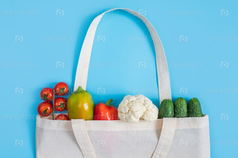 Концепция нулевых отходов. Овощи в экологически чистой многоразовой текстильной сумке на синем фоне. Без пластика. Здоровая свежая вегетарианская еда