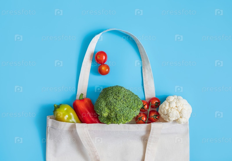Концепция нулевых отходов. Овощи в экологически чистой многоразовой текстильной сумке на синем фоне. Без пластика. Здоровая свежая вегетарианская еда