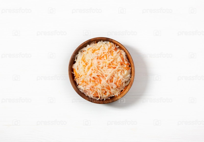 Домашняя квашеная капуста. Ферментированная пища. Квашеная капуста с морковью в деревянной миске на белом фоне