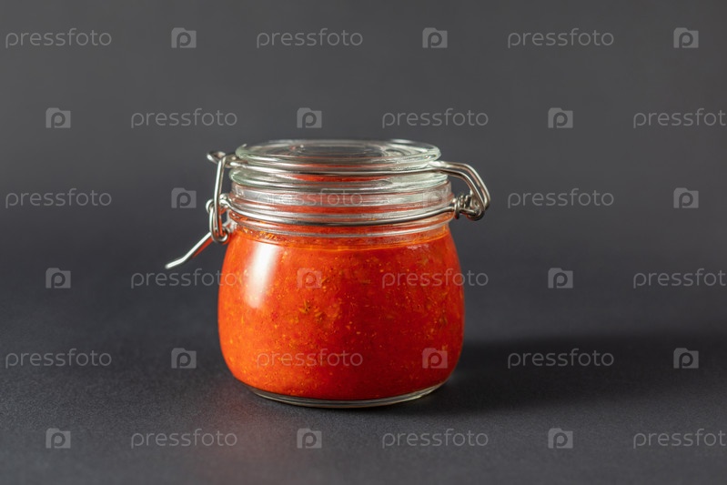 Паста из острого перца чили харисса. Аджика. Традиционная тунисская, грузинская и арабская кухня. Домашняя харисса из роз в стеклянной банке