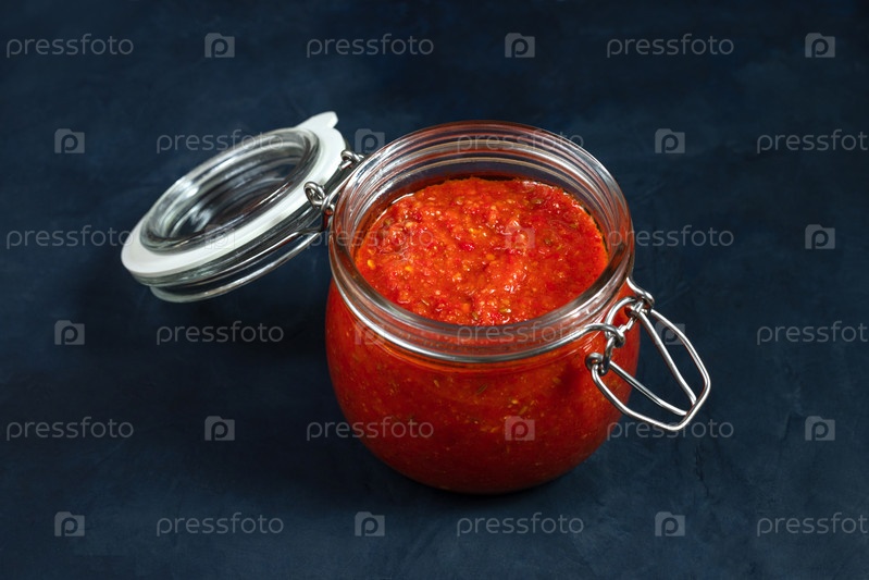 Паста из острого перца чили харисса. Аджика. Традиционная тунисская, грузинская и арабская кухня. Домашняя харисса из роз в стеклянной банке