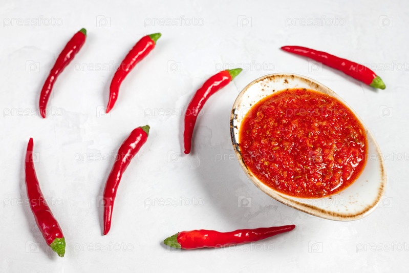 Паста из острого перца чили харисса. Аджика. Традиционная тунисская, грузинская и арабская кухня. Домашняя розовая харисса в миске