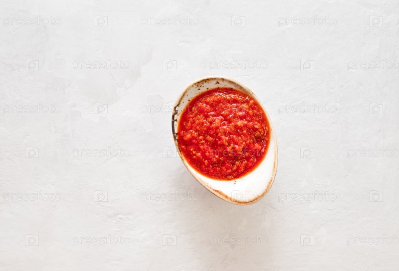 Паста из острого перца чили харисса. Аджика на белом фоне. Традиционная тунисская, грузинская и арабская кухня. Домашняя розовая харисса в миске