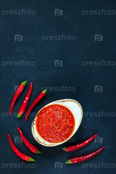 Паста из острого перца чили харисса. Аджика на голубом фоне. Традиционная тунисская, грузинская и арабская кухня. Домашняя розовая харисса в миске