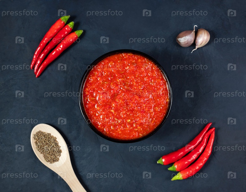 Паста из острого перца чили харисса. Аджика на голубом фоне. Традиционная тунисская, грузинская и арабская кухня. Домашняя розовая харисса в миске