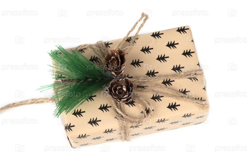Рождественская подарочная коробка украшена еловой веткой на белом фоне