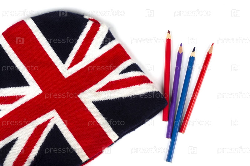 Зимняя вязаная шапка с рисунком флага Великобритании и цветными карандашами на белом фоне