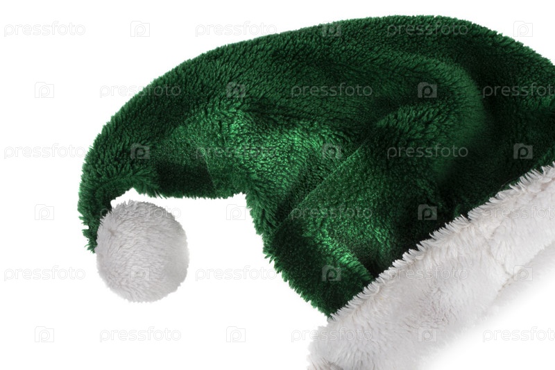 Рождественская шапка на белом фоне. Зеленая шапка санта-клауса с белым помпоном