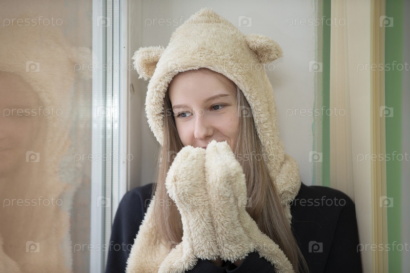 В окно смотрит девочка-подросток в смешной меховой шапке