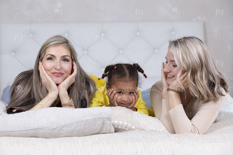 Семья из разных рас. Мама, бабушка со светлой кожей и маленькая афроамериканка лежат на диване