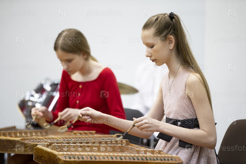 Девушка играет на цимбалах на этническом инструменте
