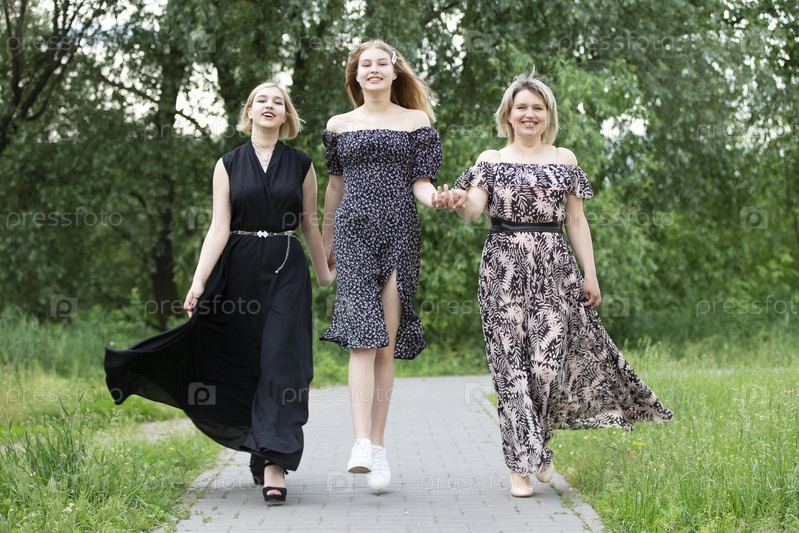 Счастливая мать с двумя взрослыми дочерьми идет по дороге и улыбается