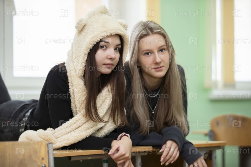 Две подружки девочки-подростки позируют и смотрят в камеру. Девочке пятнадцать лет. Старшие студенты