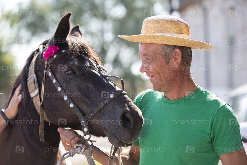 Пожилой мужчина в соломенной шляпе улыбается лошади