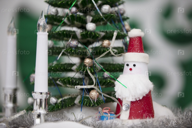 Игрушечный дед мороз стоит возле украшенной маленькой елки
