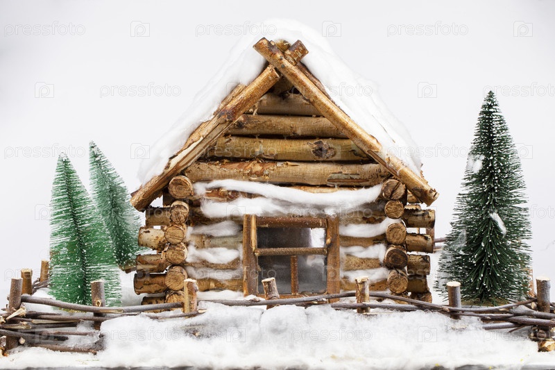 Миниатюрный деревянный деревянный дом и елки в снегу
