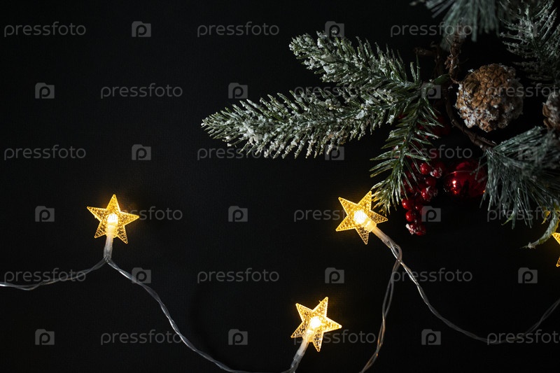 Новогодний фон с огнями и веткой елки и местом для свободного текста. Рождественские огни из гирлянды на черном фоне