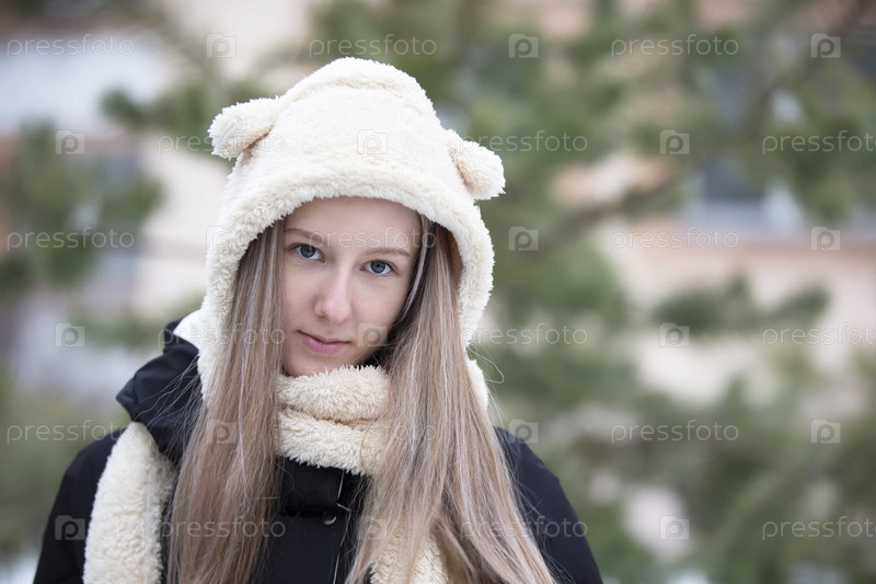 Портрет светловолосой девочки-подростка в меховой шапке в зимний день