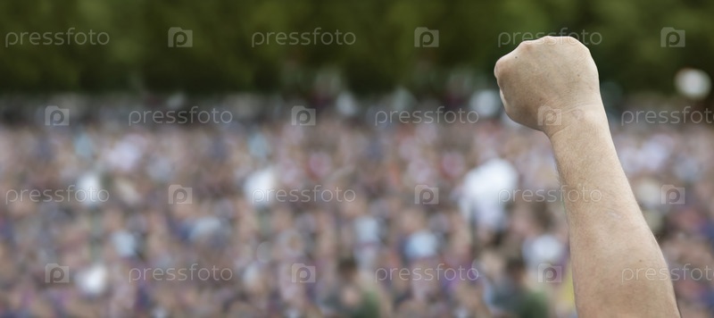 Рука в кулаке в знак протеста против размытой толпы людей