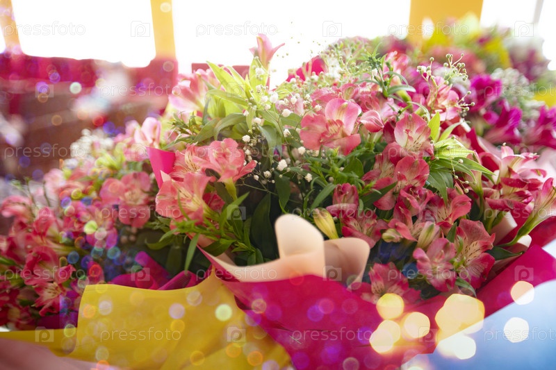 Розовые цветы в букетах на светлом фоне. Розовые лилии вокруг зеленых листьев. Закройте красивый красочный букет цветов с лилией