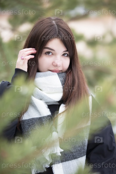 Красивая молодая брюнетка на фоне еловых веток