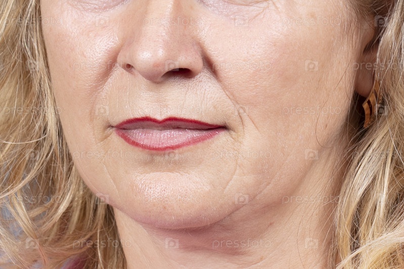 Нижняя часть лица и шеи пожилой женщины с признаками старения кожи. Возрастные изменения, дряблая обвисшая кожа лица. Косметология и концепция красоты