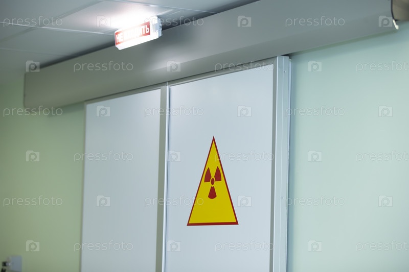 Знак радиации на дверях в больнице. Предупреждение о высокой радиации