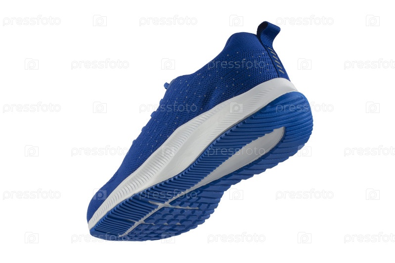 Синие кроссовки из ткани с белой подошвой на белом фоне. Спортивная обувь