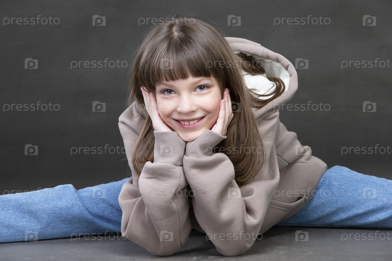 Красивая девочка среднего школьного возраста в джинсах смотрит в камеру и улыбается. Девятилетняя девочка красивой внешности