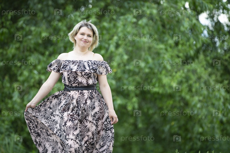 Счастливая зрелая женщина в длинном платье на летнем фоне