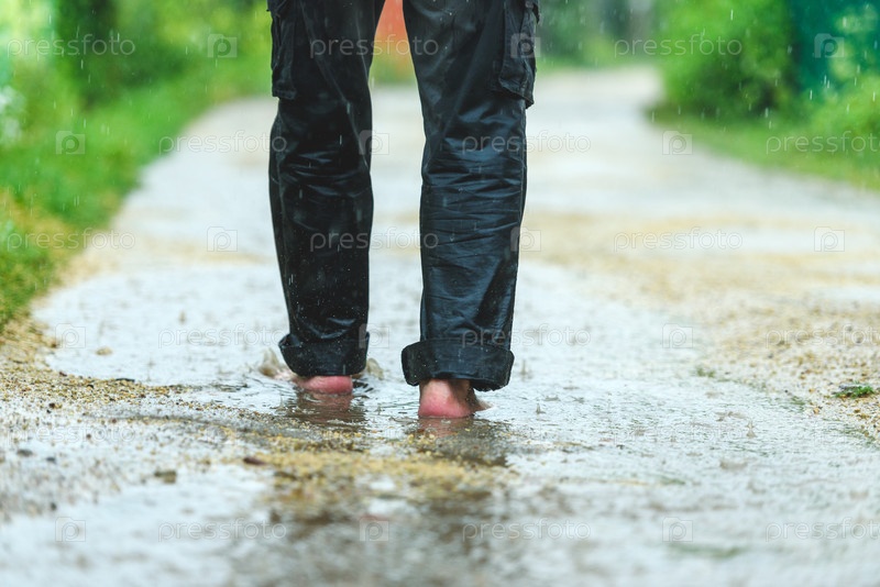 Человек под дождем босиком по лужам
