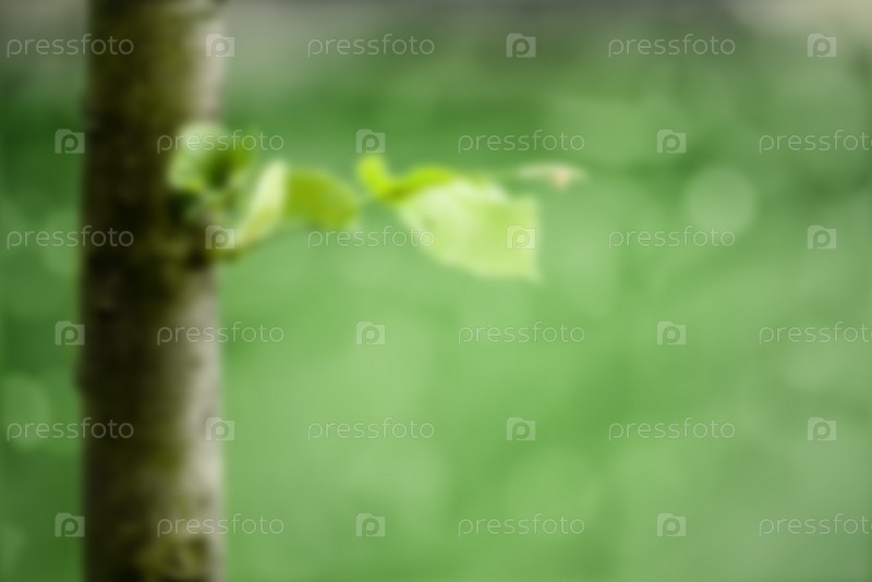 Зеленые листья представляют собой молодые побеги на стволе. Размытый фон