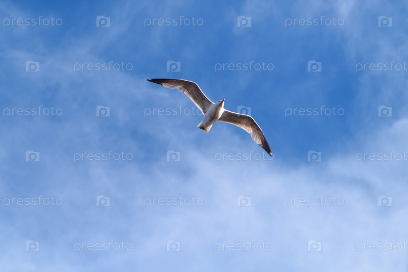 Чайка летит в голубом небе