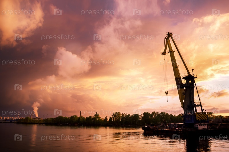 Россия, Санкт-Петербург, май 2022 г.: Красивый закат в морском порту