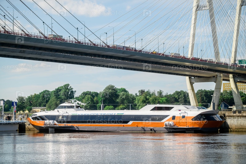 Россия, Санкт-Петербург, 4 августа 2022 г.: Прогулочный катер у причала на Неве под вантовым мостом