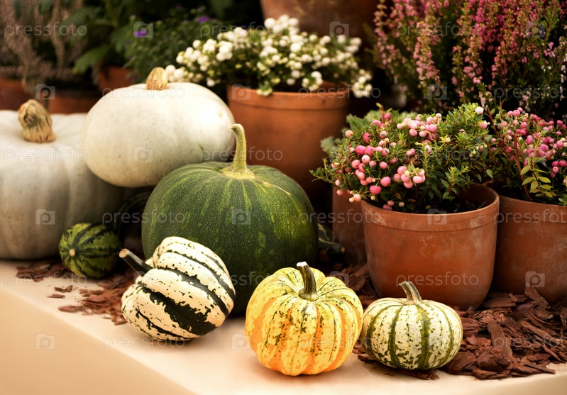 Собранные разноцветные тыквы лежали на фоне вересковых растений в горшках