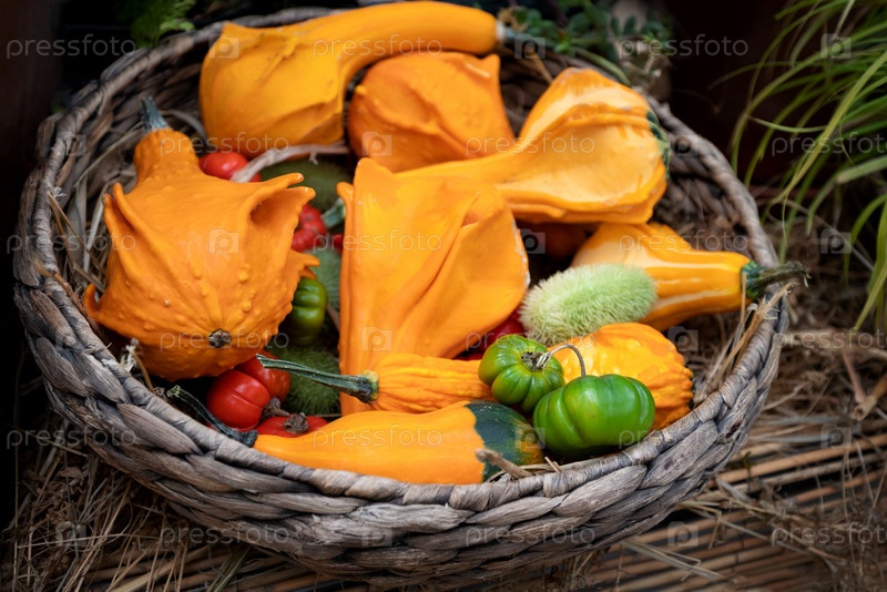 Декоративные мини-тыквы в плетеной корзине на осенней фермерской ярмарке