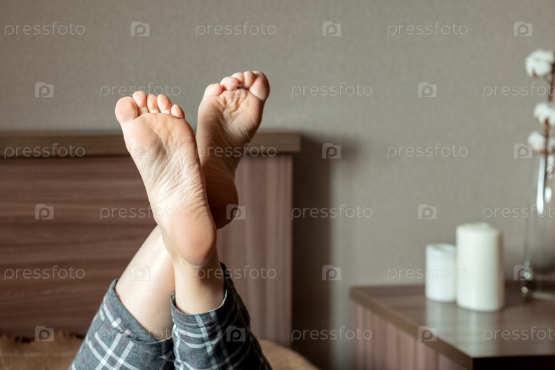 Крупный план пяток человека, лежащего дома на кровати
