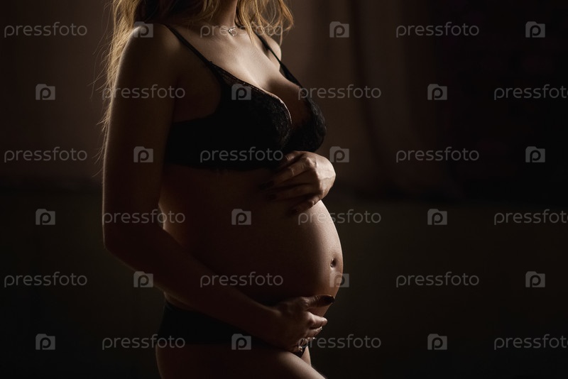 Беременная женщина в черном белье трогает живот, темный фон