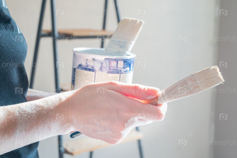 Человеческая рука, испачканная краской, держит кисть на заднем плане с банкой краски, стоящей на стремянке. Ремонт, реконструкция, концепция обустройства дома