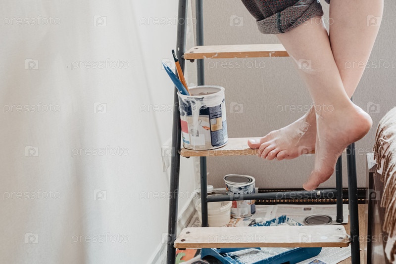Женщина с босыми скрещенными ногами, испачканными белой краской, стоит на стремянке. Концепция ремонта дома