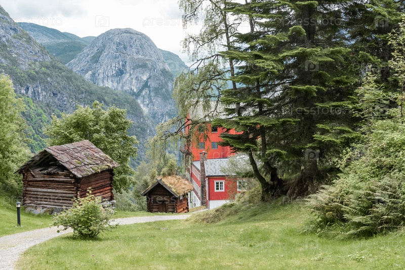 Норвежская деревня с традиционными деревянными красными домами в зеленой долине в окружении горного хребта, Норвегия