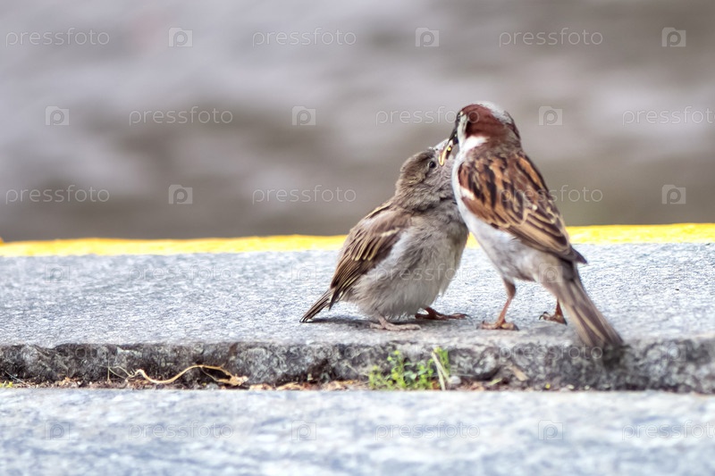 Взрослый воробей кормит своего птенца. Тема отца и сына