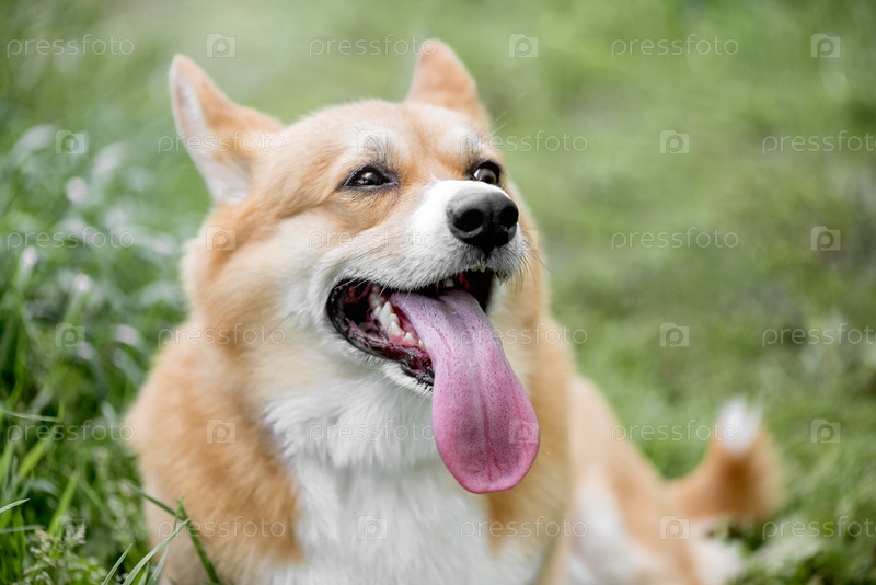 Симпатичный вельш корги пемброк сидит в траве с высунутым языком. Летняя концепция